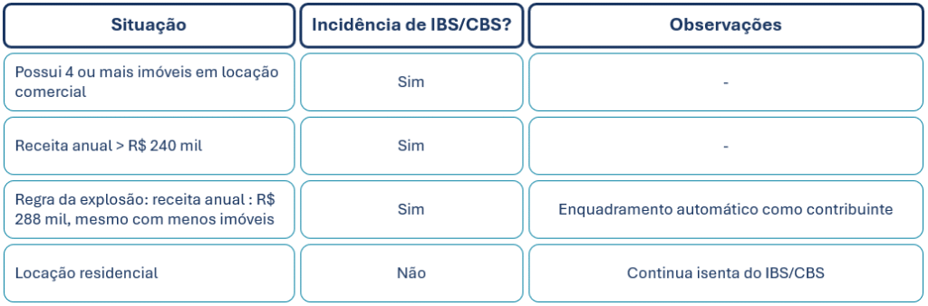 Além disso, a legislação estabelece a chamada “regra da explosão”: mesmo que o proprietário tenha menos de quatro imóveis, será considerado contribuinte caso a receita anual ultrapasse R$ 288 mil.